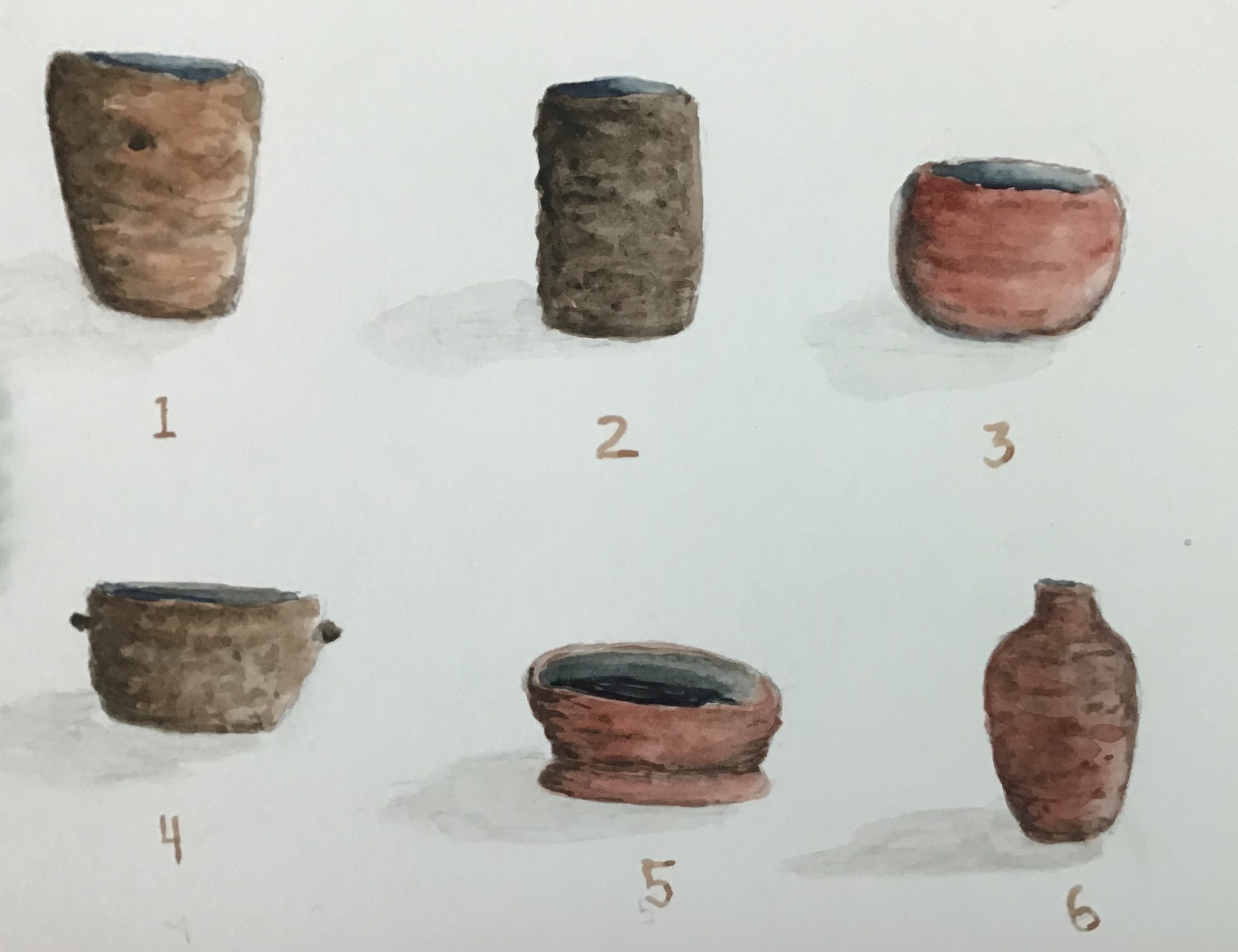 All the vessels had wipe marks on the interior, as expected since the coiling method used by the Yokuts consisted of scraping or wiping the vessels to join the coils. All vessels were made from residual clays which were a red color when fired.